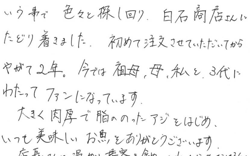 初めて注文させていただいてからやがて2年。今では祖母、母、私と3代にわたってファンになっています。