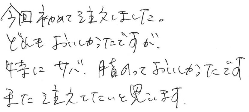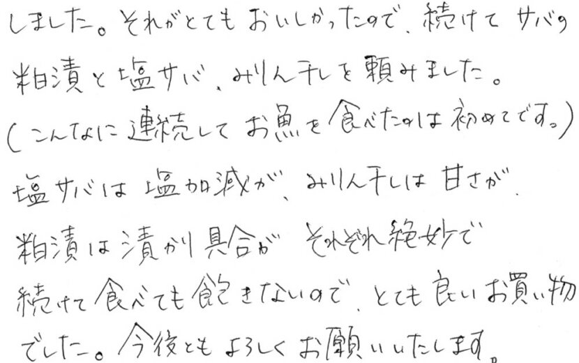 はじめて塩サバとみりん干しを注文しました。 それがとてもおいしかったので、続けてサバの粕漬と塩サバ、みりん干しを頼みました。