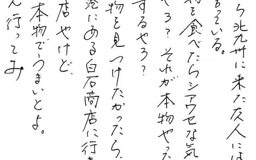 小さい店やけど、どれも本物でうまいとよ。いっぺん行ってみ