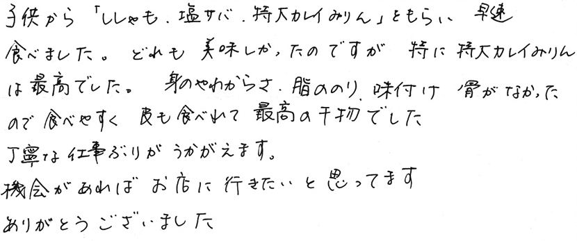 貴社の干物は、カウンターだけのお寿司やさんのお寿司ぐらい、味に違いがあると思いました。