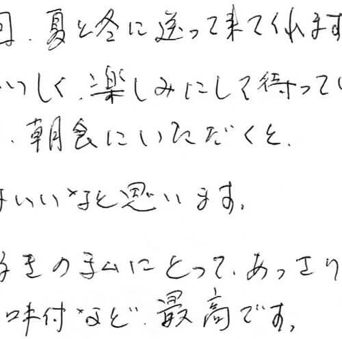送る人送る人、皆さんからとても喜ばれています。 この前は東京に送ったのですが、その方も取り寄せて又、食べたいと言ってました。