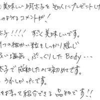 明太子がおいしいとテレビでやってたので、インターネットで調べて注文しました。(^O^) 匿名希望 男性 【店長より】 ご注文いただきありがとうござい...