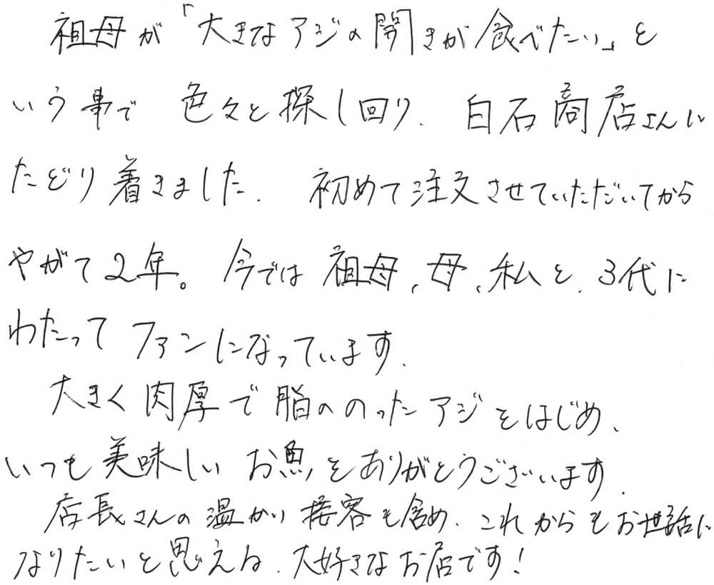 HOME BLOG お客様の声 初めて注文させていただいてからやがて2年。今では祖母、母、私と3代にわたってファンになっています。 初めて注文させていただいてからやがて2年。今では祖母、母、私と3代にわたってファンになっています。 2022.10.22お客様の声 この記事のタイトルとURLをコピーする お客様から届いた声 祖母が「大きなアジの開きが食べたい」という事で 色々と探し回り、白石商店さんにたどり着きました。 初めて注文させていただいてからやがて2年。今では祖母、母、私と3代にわたってファンになっています。 大きく肉厚で脂ののったアジをはじめ、いつも美味しいお魚をありがとうございます。 店長さんの温かい接客を含め、これからもお世話になりたいと思える、大好きなお店です! 志柿様 【店長より】 志柿様 いつもお世話になっています。 ご家族皆様に美味しく食べていただけて本当に嬉しいです! この情勢で価格が高くなっているのが申し訳ないのですが これからも美味しい干物をお届けしたいと思いますので、今後とも末永いおつき合いをどうぞよろしくお願いいたします。 嬉しいお便りありがとうございました。 Post この記事のタイトルとURLをコピーする お客様の声, 干物 干物, 門司港, 白石商店, お客様の声, 特大あじ, 通販 新鮮で美味しいので息子・娘達からのリクエストが絶えません。 門司港の広い空に広がった、特別でもない夕焼雲に
