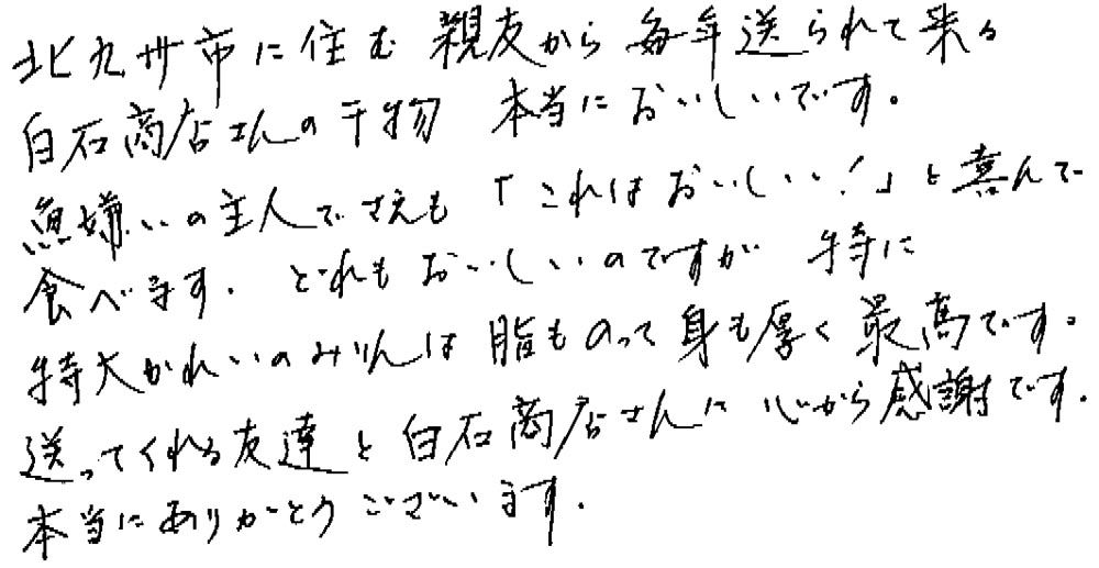 北九州に住む親友から毎年送られて来る白石商店さんの干物 本当においしいです。