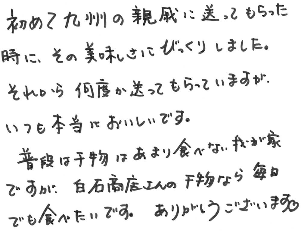 HOME BLOG お客様の声 普段は干物はあまり食べない我が家ですが、白石商店さんの干物なら毎日でも食べたいです。 普段は干物はあまり食べない我が家ですが、白石商店さんの干物なら毎日でも食べたいです。 2023.05.04お客様の声 この記事のタイトルとURLをコピーする お客様から届いた声 初めて九州の親戚に送ってもらった時に、その美味しさにびっくりしました。 それから何度か送ってもらっていますが、いつも本当においしいです。 普段は干物はあまり食べない我が家ですが、白石商店さんの干物なら毎日でも食べたいです。 ありがとうございます。 匿名希望様 【店長より】 美味しく食べていただけて嬉しいです! いつでも、どれでも魚本来の美味しさを楽しんでもらえるように、気を付けていますので 色々な味を楽しんでくださいね。 嬉しいお便りありがとうございます! Post この記事のタイトルとURLをコピーする お客様の声, 干物 干物, 門司港, 白石商店, お客様の声, 通販 今日も一日お疲れ様でした。 先日、ある方から、お宅様のお品を頂きまして、あまりの美味しさにびっくりしました。