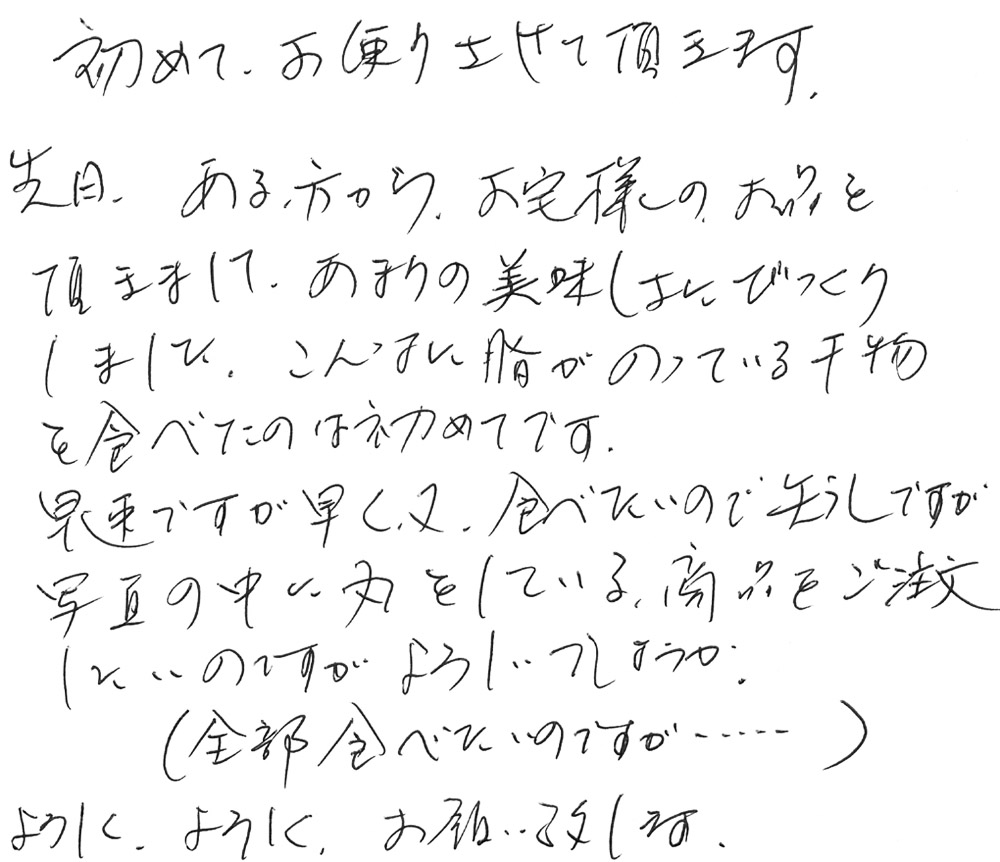 HOME BLOG お客様の声 先日、ある方から、お宅様のお品を頂きまして、あまりの美味しさにびっくりしました。 先日、ある方から、お宅様のお品を頂きまして、あまりの美味しさにびっくりしました。 2023.05.04お客様の声 この記事のタイトルとURLをコピーする お客様から届いた声 初めて、お便りさせて頂きます。 先日、ある方から、お宅様のお品を頂きまして、あまりの美味しさにびっくりしました。 こんなに脂がのっている干物を食べたのは初めてです。 早速ですが早く、又、食べたいので失礼ですが写真の中に丸をしている、商品をご注文したいのですがよろしいでしょうか。(全部食べたいのですが・・・) よろしく、よろしく、お願い致します。 匿名希望様 【店長より】 嬉しいお便りありがとうございます! とても気に入っていただけたご様子で本当にうれしいです。 贈答の品には価格ののった物は入れていませんので、ご注文も分かりにくかったと思いますが ご自宅の注文の品と一緒にパンフレットをお届けさせていただきます。 いつでも上質の海産物をお届けしたいと思いますので、お気軽にご注文下さいませ。 今後ともどうぞよろしくお願いいたします。 Post この記事のタイトルとURLをコピーする お客様の声, 干物 干物, 門司港, 白石商店, お客様の声, 通販 普段は干物はあまり食べない我が家ですが、白石商店さんの干物なら毎日でも食べたいです。 この鮮度のいい脂のり、旨味と程よい塩気!特大あじを食べてみた。