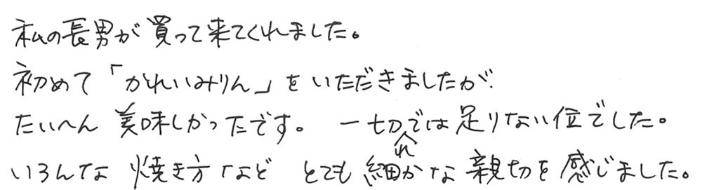 HOME BLOG お客様の声 いろいろな焼き方などとても細かな親切を感じました。 いろいろな焼き方などとても細かな親切を感じました。 2023.05.07お客様の声 この記事のタイトルとURLをコピーする お客様から届いた声 私の長男が買って来てくれました。 初めて「かれいみりん」をいただきましたが、たいへん美味しかったです。 一切れでは足りない位でした。 いろいろな焼き方などとても細かな親切を感じました。 匿名希望様 【店長より】 かれいみりん、美味しいですよね。お子様から大人まで人気の干物です。 素材の美味しさを存分に楽しむ為には、保存と焼き方が大変重要ですので、贈答には”私が試した”【焼き方のしおり】をお付けしています。 ぜひ、素材ごとのちょうどいい焼き具合をお試しください。 ご長男様にもよろしくお伝えくださいませ!嬉しいお便りありがとうございました。 Post この記事のタイトルとURLをコピーする お客様の声, 干物 干物, 門司港, 白石商店, お客様の声, かれいみりん, 通販 白石商店さんに出会えて嬉しいです。リピ致します。 『店長のつぶやき』始めます。