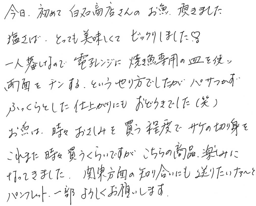 HOME BLOG お客様の声 塩さば、とっても美味しくて ビックリしました♡ 塩さば、とっても美味しくて ビックリしました♡ 2023.09.18お客様の声 この記事のタイトルとURLをコピーする お客様から届いた声 今日、初めて白石商店さんのお魚 頂きました。 塩さば、とっても美味しくて ビックリしました♡ 一人暮しなので 電子レンジに焼き魚専用の皿を使い両面をチンする、というやり方でしたが パサつかずふっくらとした仕上がりにも驚きでした(笑) お魚は、時々おさしみを買う程度で サケの切り身をこれまた時々買うくらいですが こちらの商品、楽しみになってきました。 関東方面の知り合いにも送りたいナァ~と パンフレット一部 よろしくお願いします。 匿名希望様 【店長より】 食卓への登場機会の少ない海産物を気に入っていただけて嬉しいです! 塩さばも丁度新物に切り替わった時期くらいで、より美味しかったかもしれませんね。 その他の干物も上質を揃えていますので、関東のお友達にも機会がありましたらぜひお届けください。 喜んでいただける商品をお届けしたいと思います。 嬉しいお便りありがとうございました。 FBでも情報更新中です。 https://www.facebook.com/mojikou.shiraishi/ 白石商店通販ページはこちら https://harusio.com Post この記事のタイトルとURLをコピーする お客様の声, 干物 干物, 門司港, 塩サバ, 白石商店, お客様の声, 通販 娘がスポーツを頑張っているので、干しエビがカルシウム豊富だと知り、探していたら辿り着きました。 白石商店さんの思いやりある包装や、作り方や、もちろん美味しさも とりこになりました。