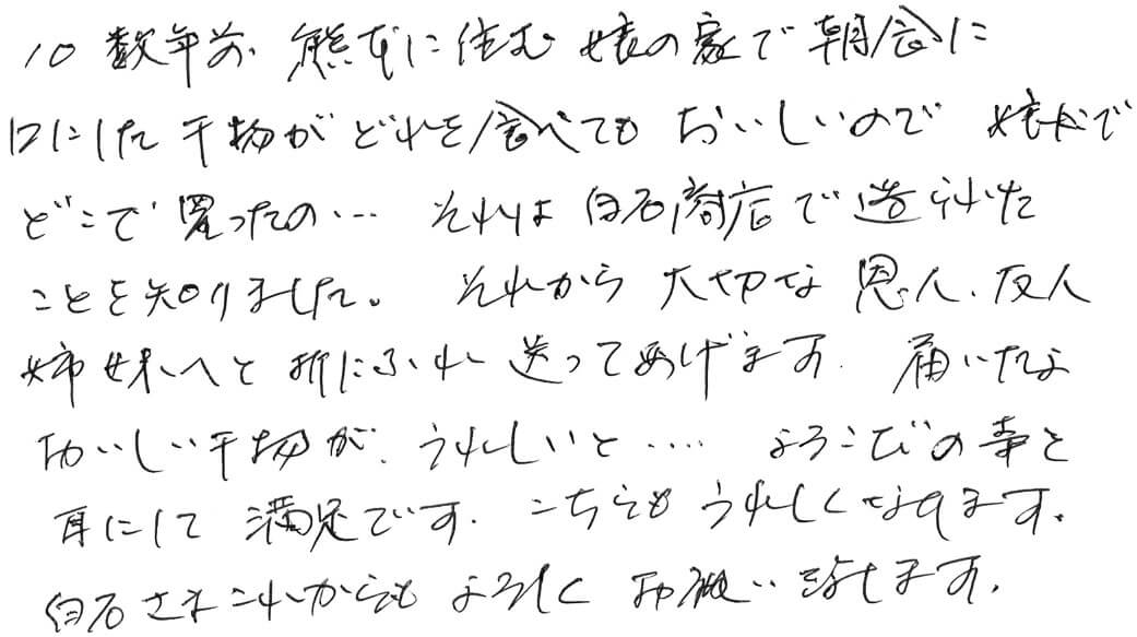 HOME BLOG お客様の声 届いたよ おいしい干物がうれしいと・・・ よろこびの声を耳にして満足です。こちらもうれしくなります。 届いたよ おいしい干物がうれしいと・・・ よろこびの声を耳にして満足です。こちらもうれしくなります。 2024.09.10お客様の声 この記事のタイトルとURLをコピーする お客様から届いた声 10数年前、熊本に住む娘の家で朝食に口にした干物がどれを食べてもおいしいので、 娘にどこで買ったの・・・それは白石商店で造られたことを知りました。 それから大切な恩人、友人、姉妹へと折にふれ送ってあげます。 届いたよ おいしい干物が、うれしいと・・・ よろこびの声を耳にして満足です。こちらもうれしくなります。 白石さまこれからもよろしくお願い致します。 ※文章や字がにがてですので やっと感謝の気持ちでペンをとりました。 乱筆乱文おゆるしくださいませ。 瀬戸下様 【店長より】 永くお付き合いいただき本当にありがとうございます。 お子様とも縁あって長いお付き合いができて嬉しいです! 干物は厳選した製造元に特注品を頼んだりし、当店で再度加工しています。 美味しい上質の物ばかりを揃えるようにしていますので、贈答・ご自宅用にこれからもどうぞご利用くださいませ。 気持ちのこもった嬉しいお便りありがとうございました。 FBでも情報更新中です https://www.facebook.com/mojikou.shiraishi/ Instagramはこちら https://www.instagram.com/shiraishisyouten/ 白石商店通販ページはこちら https://harusio.com/ Post この記事のタイトルとURLをコピーする お客様の声, 干物 干物, 門司港, 白石商店, お客様の声, 通販 2024年9月営業日のご案内です 幸せな一時 そしてたのしい会話、元気なみなもと、ありがとうございました。