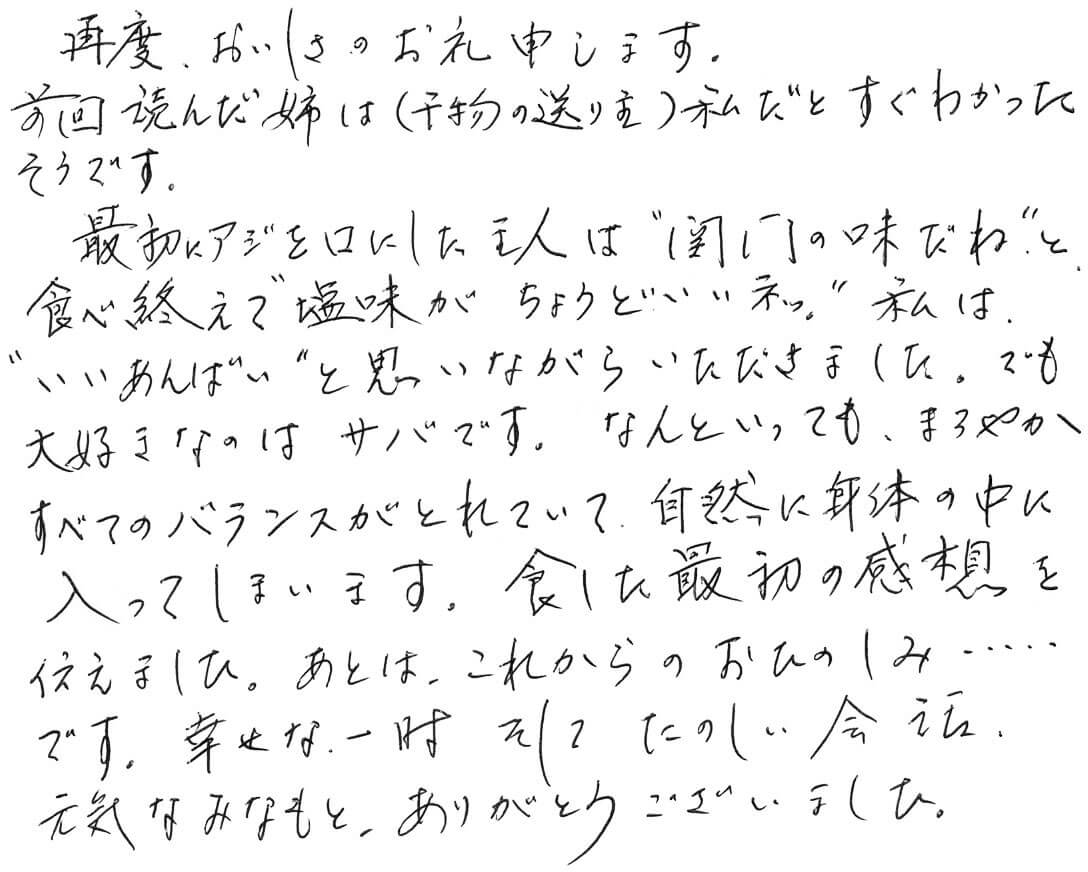 HOME BLOG お客様の声 幸せな一時 そしてたのしい会話、元気なみなもと、ありがとうございました。 幸せな一時 そしてたのしい会話、元気なみなもと、ありがとうございました。 2024.09.10お客様の声 この記事のタイトルとURLをコピーする お客様から届いた声 再度、おいしさのお礼申します。 前回読んだ姉は(干物の送り主)私だとすぐわかったそうです。 最初にアジを口にした主人は”関門の味だね”と、食べ終えて”塩味がちょうどいいネッ” 私は”いいあんばい”と思いながらいただきました。 でも、大好きなのはサバです。なんといっても、まろやか すべてのバランスがとれていて、自然に体の中に入ってしまいます。 食した最初の感想を伝えました。あとは、これからのおたのしみ・・・・・・です。 幸せな一時 そしてたのしい会話、元気なみなもと、ありがとうございました。 細川様 【店長より】 アジ、そしてサバを美味しく食べていただきありがとうございました! ご夫婦お二人の楽しい食卓の様子が目に浮かぶようです。 これからも話が弾むような上質の海産物をお届けしたいと思いますので、今後ともどうぞよろしくお願いいたします。 お姉さまにもどうぞよろしくお伝えくださいませ。 嬉しいお便りありがとうございました! FBでも情報更新中です https://www.facebook.com/mojikou.shiraishi/ Instagramはこちら https://www.instagram.com/shiraishisyouten/ 白石商店通販ページはこちら https://harusio.com/ Post この記事のタイトルとURLをコピーする お客様の声, 干物 干物, 門司港, 白石商店, お客様の声, 通販 届いたよ おいしい干物がうれしいと・・・ よろこびの声を耳にして満足です。こちらもうれしくなります。 お父さんの誕生日プレゼントに