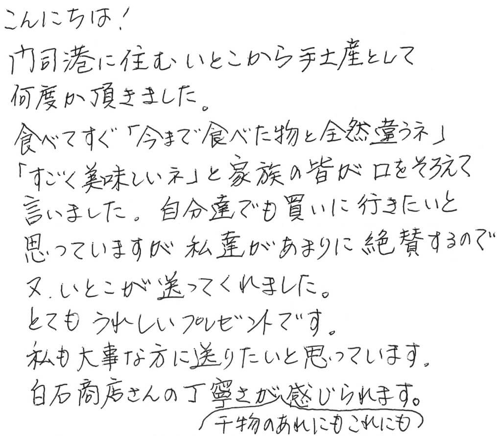 HOME BLOG お客様の声 私達があまりに絶賛するので又、いとこが送ってくれました。とてもうれしいプレゼントです。 私達があまりに絶賛するので又、いとこが送ってくれました。とてもうれしいプレゼントです。 2024.09.13お客様の声 この記事のタイトルとURLをコピーする お客様から届いた声 こんにちは! 門司港に住むいとこから手土産として何度か頂きました。 食べてすぐ「今まで食べた物と全然違うネ」 「すごく美味しいネ」と家族の皆が口をそろえて言いました。 自分達でも買いに行きたいと思っていますが 私達があまりに絶賛するので又、いとこが送ってくれました。 とてもうれしいプレゼントです。 私も大事な方に送りたいと思っています。 白石商店さんの丁寧さが干物のあれにもこれにも感じられます。 板平様 【店長より】 いとこがまたあげたくなるくらい、喜んでもらえたこと本当に嬉しいです! 魚本来の美味しさを、多くの方に味わっていただいて魚好きを増やしたいと思っていますので 上質にこだわり、いただいた方が最後の品まで美味しく食べていただけるよう気を配っています。 いつでも変わらない商いを続けていきたいと思いますので、今後ともどうぞよろしくお願いいたします。 嬉しいお便りありがとうございました! FBでも情報更新中です https://www.facebook.com/mojikou.shiraishi/ Instagramはこちら https://www.instagram.com/shiraishisyouten/ 白石商店通販ページはこちら https://harusio.com/ Post この記事のタイトルとURLをコピーする お客様の声, 干物 干物, 門司港, 白石商店, お客様の声, 通販 門司港に住んでいた頃から食べていて美味しかったから。 毎日暑いけど、日暮れは早くなってきましたね。