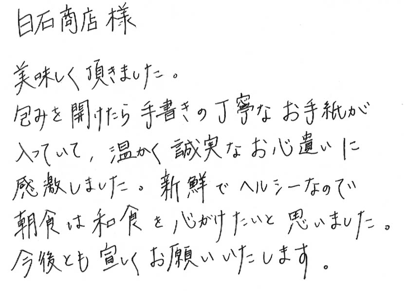 HOME BLOG お客様の声 心遣いに感激しました 心遣いに感激しました 2020.03.17お客様の声 この記事のタイトルとURLをコピーする お客様から届いた声 白石商店様 美味しく頂きました。 包みを開けたら手書きの丁寧なお手紙が入っていて、温かく誠実なお心遣いに感激しました。 新鮮でヘルシーなので朝食は和食を心がけたいと思いました。 今後とも宜しくお願いいたします。 匿名希望様 【店長より】 手紙は嫁が書いていますので、お客様に喜んでいただけていると嫁も喜ぶと思います笑。 こちらこそ、今後ともどうぞよろしくお願いいたします。嬉しいお便りありがとうございました。 Post この記事のタイトルとURLをコピーする お客様の声, 干物 干物, 門司港, 白石商店, お客様の声, 紹介 関門海峡は癒されます。 明太子が無料でついてくるセット