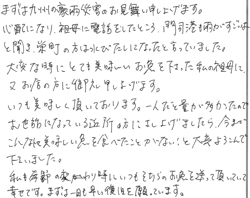 大変な時にとても美味しいお魚を下さった私の祖母に、又 お店の方に御礼申し上げます。
