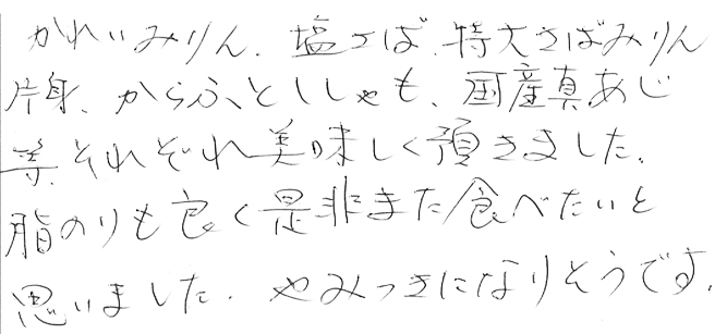 脂のりも良く是非また食べたいと思いました。やみつきになりそうです。