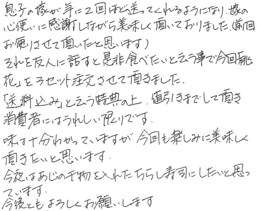 息子の嫁が年に2回ほど送ってくれるようになり、嫁の心使いに感謝しながら美味しく頂いておりました。(前回お便りさせて頂いたと思います)