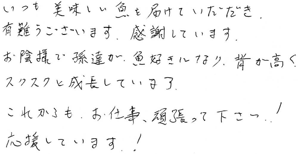 いつもありがとうございます。中野様に喜んでいただけて、そしてお孫様も魚好きになってくれて本当に嬉しいです。私も中野様からのお便りで元気をいただいています。