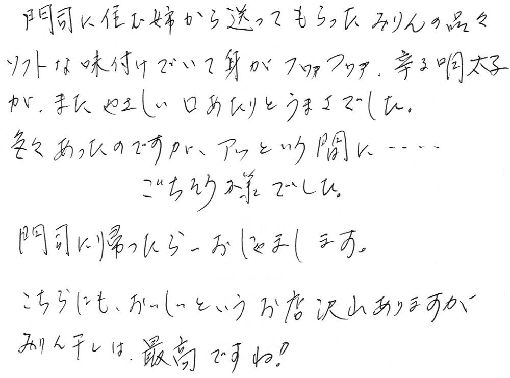 HOME BLOG お客様の声 門司に住む姉から送ってもらったみりんの品々。ソフトな味付けでいて身がフヮァフヮァ。辛子明太子が、またやさしい口あたりとうまさでした。 門司に住む姉から送ってもらったみりんの品々。ソフトな味付けでいて身がフヮァフヮァ。辛子明太子が、またやさしい口あたりとうまさでした。 2021.05.27お客様の声 この記事のタイトルとURLをコピーする お客様から届いた声 門司に住む姉から送ってもらったみりんの品々 ソフトな味付けでいて身がフヮァフヮァ。 辛子明太子が、またやさしい口あたりとうまさでした。 色々あったのですが、アッという間にごちそう様でした。 門司に帰ったら、おじゃまします。 こちらにもおいしいというお店 沢山ありますが、みりん干しは最高ですね! 細川様 【店長より】 手作り明太子も、干物も喜んでいただけたようで、また美味しいお店の仲間入りができて嬉しいです。 門司に変えられた際に、時間が取れましたらぜひご来店もお待ちしています。嬉しいお便りありがとうございました。 Post この記事のタイトルとURLをコピーする お客様の声, 明太子, 干物 干物, 門司港, 国産明太子, 白石商店, お客様の声, 通販 日没後に山陰の雲が輝き出しました。出会えてよかった。門司港にカメラは必需品! お好きな方が定期的に買われている『国産さより丸干し』を食べてみました。お酒の用意は必須です!