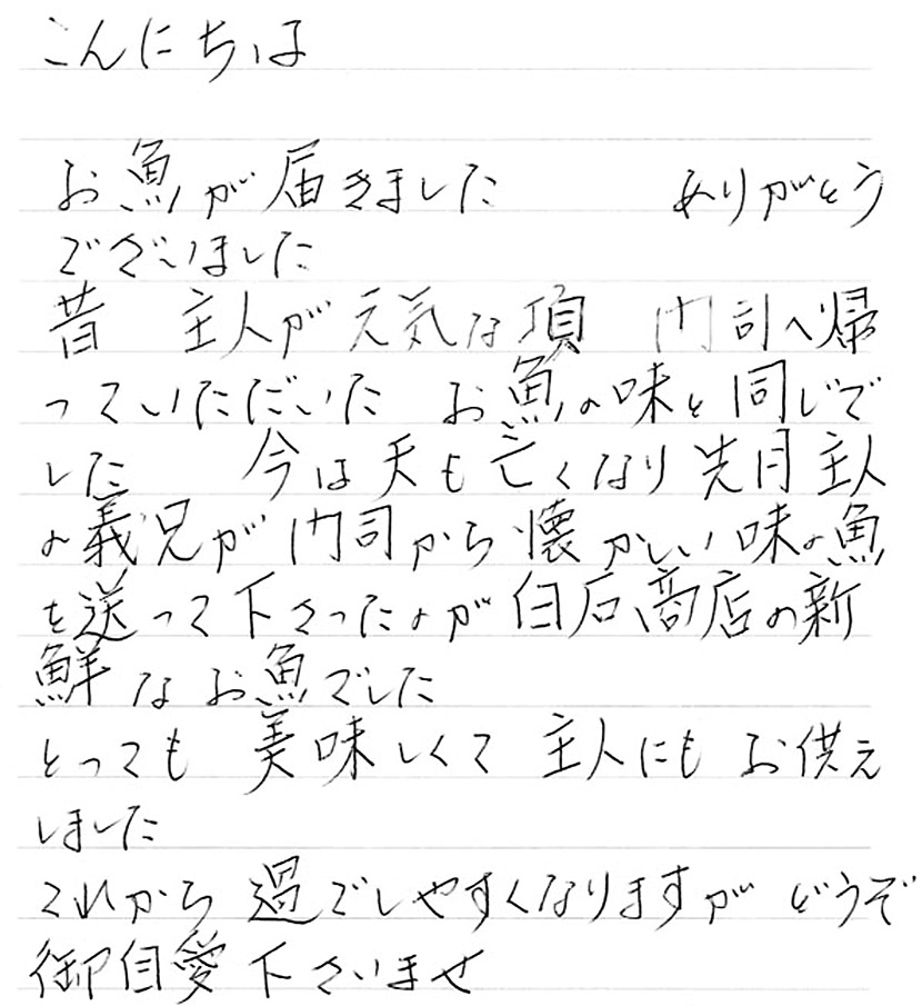 HOME BLOG お客様の声 お魚が届きました ありがとうございました 昔 主人が元気な頃 門司へ帰っていただいた お魚の味と同じでした お魚が届きました ありがとうございました 昔 主人が元気な頃 門司へ帰っていただいた お魚の味と同じでした 2021.05.31お客様の声 この記事のタイトルとURLをコピーする お客様から届いた声 こんにちは お魚が届きました ありがとうございました 昔 主人が元気な頃 門司へ帰っていただいた お魚の味と同じでした 今は夫も亡くなり先月主人の義兄が門司から懐かしい味の魚を送って下さったのが白石商店の新鮮なお魚でした とっても 美味しくて 主人にもお供えしました これから過ごしやすくなりますが どうぞ御自愛下さいませ 匿名希望様 【店長より】 奥様と一緒に、ご主人さまにも喜んでいただけていれば本当に嬉しいです。 奥様のお元気な毎日が、ご主人様の幸せだと思います。どうぞ健やかな日々をお過ごしくださいませ。お便りありがとうございました。 Post この記事のタイトルとURLをコピーする お客様の声, 干物 干物, 門司港, 白石商店, お客様の声, 通販 曇り空の淡い光に、菖蒲と緑がいい色出してました。梅雨の季節に行く『夜宮公園』いいですよ。 歩くだけでも心が清められる気がします。平日の夕方に宗像大社へお参りに行きました。