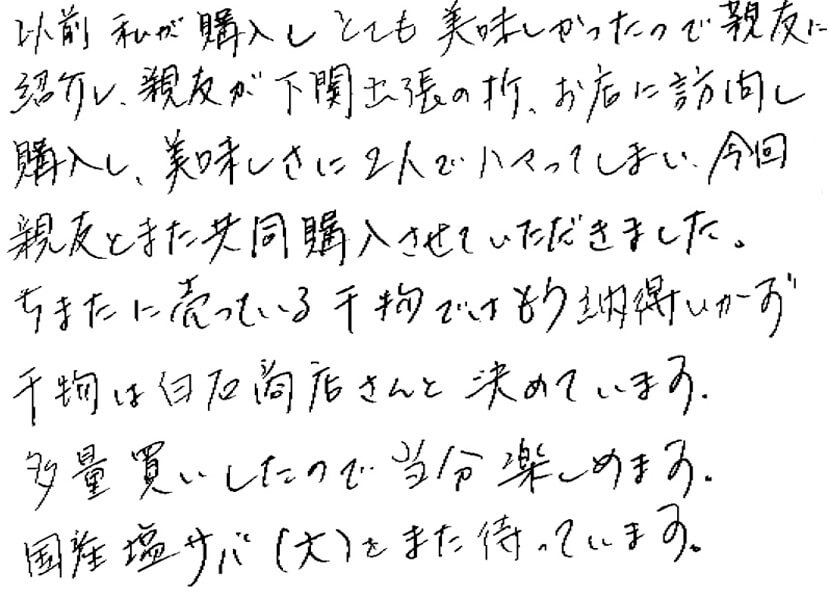HOME BLOG お客様の声 美味しさにハマってしまい、今回 親友とまた共同購入させていただきました。 美味しさにハマってしまい、今回 親友とまた共同購入させていただきました。 2021.08.29お客様の声 この記事のタイトルとURLをコピーする お客様から届いた声 以前私が購入しとても美味しかったので親友に紹介し 親友が下関出張の折、お店に訪問し購入し、美味しさに2人でハマってしまい 今回親友とまた共同購入させていていただきました。 ちまたに売っている干物ではもう納得いかず干物は白石商店さんと決めています。 多量買いしたので当分楽しめます。 国産塩サバ(大)をまた待っています。 匿名希望様 【店長より】 お友達と一緒にハマっていただき(笑)本当に嬉しいです!ご紹介いただきありがとうございました。 これからも紹介のお友達が増えるように、美味しい干物をお届けさせていただきますね。 今後ともどうぞよろしくお願いいたします。嬉しいお便りありがとうございました! Post この記事のタイトルとURLをコピーする お客様の声, 干物 干物, 門司港, 白石商店, お客様の声, 通販 自由文の熨斗もお付けできます。気持ちを伝えよう、熨斗の指定方法つくりました。 9月営業日のお知らせ