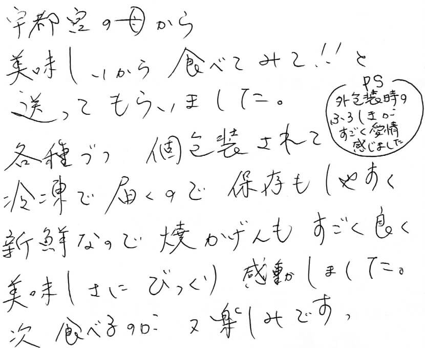 HOME BLOG お客様の声 宇都宮の母から 美味しいから食べてみて!!と送ってもらいました。 宇都宮の母から 美味しいから食べてみて!!と送ってもらいました。 2021.09.20お客様の声 この記事のタイトルとURLをコピーする お客様から届いた声 宇都宮の母から 美味しいから食べてみて!! と送ってもらいました。 各種ずつ個包装されて冷凍で届くので保存もしやすく新鮮なので焼きかげんもすごく良く美味しさにびっくり 感動しました。 次 食べるのが、又 楽しみです。 PS 外包装時のふろしきがすごく愛情感じました 長谷川様 【店長より】 いただいた方に喜んでもらえるように、そして最後まで品質そのまま美味しく食べていただけるようにと考えてパッケージしています。 感動までしてもらえて嬉しいです。 これからも美味しい干物を販売したいと思いますので、どうぞよろしくお願いいたします。 お名前は伏せておきましたが、お母様にもよろしくお伝えくださいませ。ありがとうございます。 Post この記事のタイトルとURLをコピーする お客様の声, 干物 干物, 門司港, 白石商店, お客様の声 もう脂の乗りが最高の焼き鯖で絶品でした! また購入させて頂きます。 丸山のバス停。夏の夕暮れに
