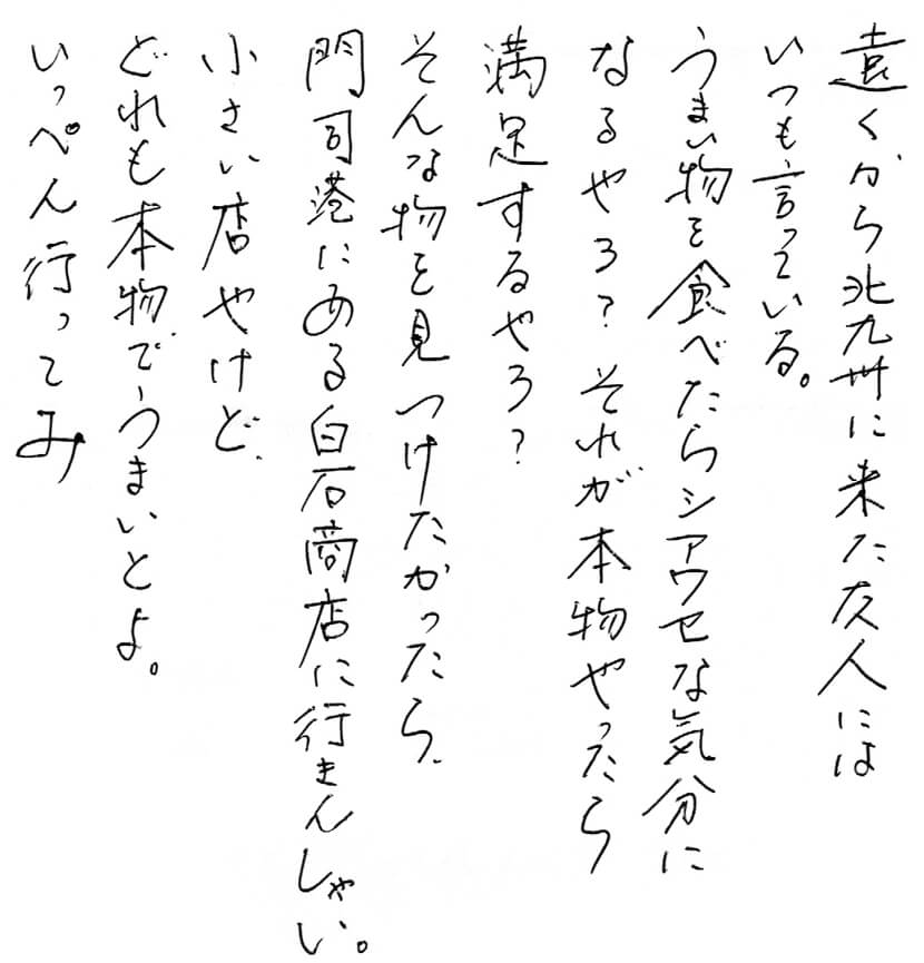 小さい店やけど、どれも本物でうまいとよ。いっぺん行ってみ