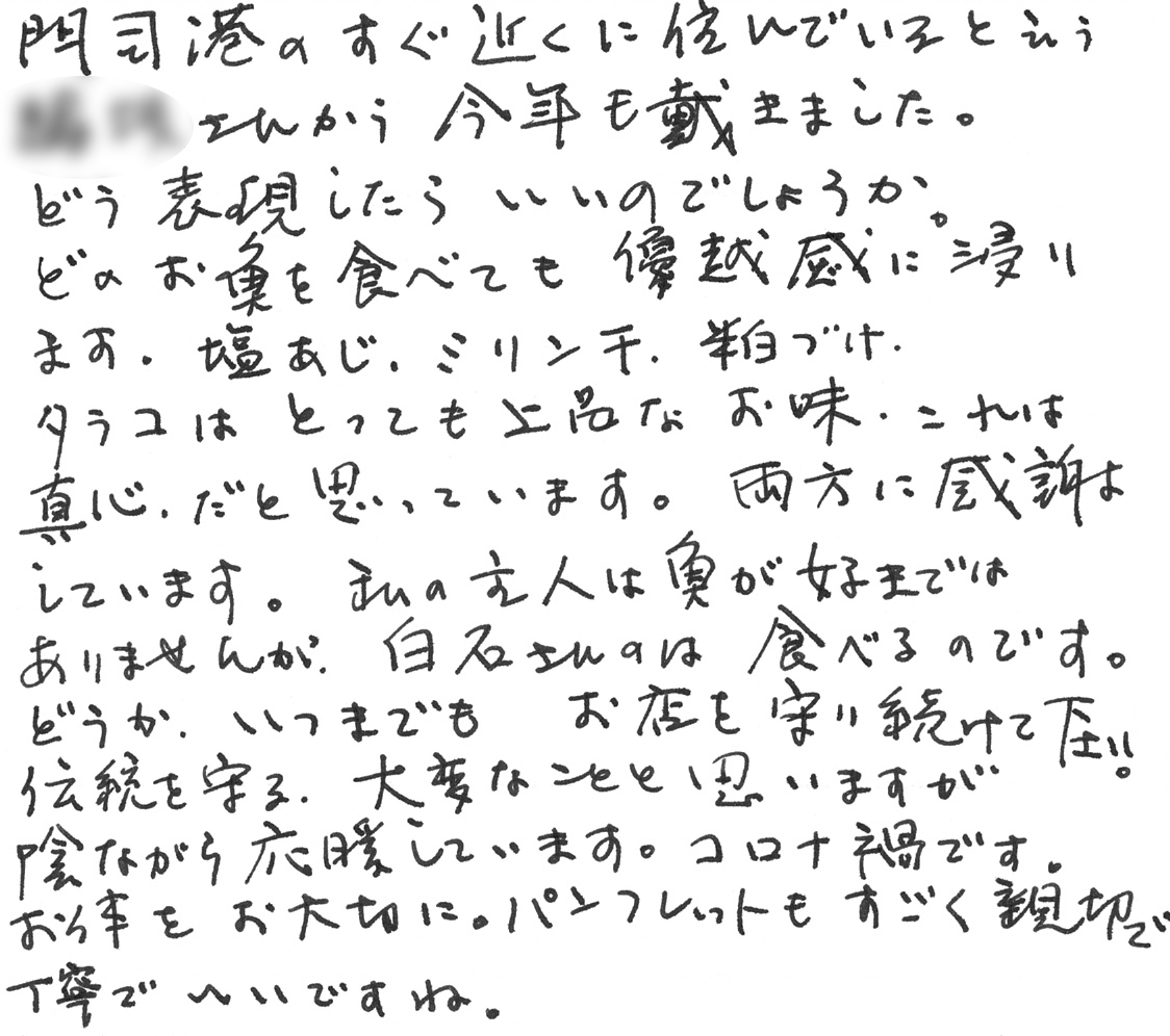 HOME BLOG お客様の声 私の主人は魚が好きではありませんが、白石さんのは食べるのです。 私の主人は魚が好きではありませんが、白石さんのは食べるのです。 2023.05.22お客様の声 この記事のタイトルとURLをコピーする お客様から届いた声 門司港のすぐ近くに住んでいると云う○○さんから今年も戴きました。 どう表現したらいいのでしょうか。どのお魚を食べても優越感に浸ります。 塩あじ、ミリン干、粕づけ、タラコはとっても上品なお味、これは真心、だと思っています。 両方に感謝しています。 私の主人は魚が好きではありませんが、白石さんのは食べるのです。 どうか、いつまでも お店を守り続けてください。 伝統を守る、大変なことと思いますが、陰ながら応援しています。 コロナ禍です。お体をお大切に。パンフレットもすごく親切で丁寧でいいですね。 小川様 【店長より】 美味しく食べていただけて、幸せな気持ちにまでなっていただけたこと、本当に嬉しいです! ご自宅での毎日の食事に幸せを感じられることは、心の裕福だと思うんです。 先代から受け継がれた明太子も、国産にこだわり上質の素材で丁寧に味付けしています。感じてもらえて作り手冥利に尽きます。 商売を続けていると色々なことも起こりますが、それまで以上に満足していただける商いができるようにと心掛けています。 また美味しい海産物がお届けできるように精進いたします。 嬉しいお便り本当にありがとうございました。 旦那様にもどうぞよろしくお伝えくださいませ。 Post この記事のタイトルとURLをコピーする お客様の声, 干物 干物, 門司港, 国産明太子, 白石商店, お客様の声, 通販 初めてのHDD交換、やってみました。 お魚をこんなに美味しく感じたのは初めてでした。