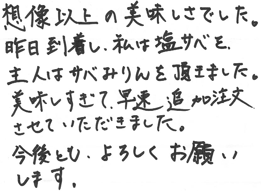 HOME BLOG お客様の声 想像以上の美味しさでした 想像以上の美味しさでした 2019.09.14お客様の声 この記事のタイトルとURLをコピーする お客様から届いた声 想像以上の美味しさでした。昨日到着し、私は塩さばを、主人はサバみりんを頂きました。 美味しすぎて、早速追加注文させていただきました。 今後とも、よろしくお願いします。 荒武様 【店長より】 喜んでいただけてよかったです。サバは人気で店頭でもよく売れてます。いつでも新鮮な干物をお届けしようと思いますので今後ともよろしくお願いいたします。嬉しいお便りありがとうございました。 Post この記事のタイトルとURLをコピーする お客様の声, 干物 干物, 門司港, 白石商店, お客様の声 手作り明太子をちょっと試食 しっかり味でご飯がすすむ!