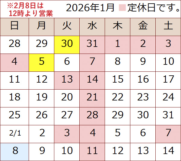 HOME BLOG お知らせ 2026年1月営業日のご案内です 2026年1月営業日のご案内です 2025.12.29お知らせ この記事のタイトルとURLをコピーする 2026年1月の営業日です 2026年1月は第一火曜日を営業しますので、第二火曜日13日にお休みをいただきます。 また、2月7日(土)に祝事でお休みをいただきます。 翌8日(日曜日)は12時からの営業とさせていただきます。どうぞよろしくお願いいたします。 『かれいみりん』は在庫無くなり次第、販売終了となります。 また、送料込みセットも『新送料込みセット』発売まで、一部セットは販売停止とさせていただきます。 【 通常時 】 平日は9時~18時 日祭日は9時~17時の営業です。 Post この記事のタイトルとURLをコピーする お知らせ 門司港, 白石商店, 営業日 2025年12月営業日のご案内です 新年あけましておめでとうございます
