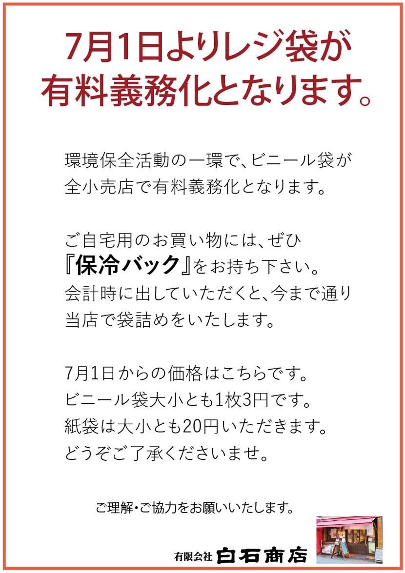 HOME BLOG お知らせ 7月1日よりレジ袋有料化です。 7月1日よりレジ袋有料化です。 2020.06.27お知らせ この記事のタイトルとURLをコピーする 7月1日より、全ての小売店対象に『レジ袋の有料化』が義務付けられました。 ギフトでのご利用も多いので、バランスをとるため紙袋も一律有料とさせていただきます。 大変ご迷惑をお掛けしますが、どうぞご了承くださいませ。 『オンラインショップ』はこちら 門司港の白石商店はこちら Post この記事のタイトルとURLをコピーする お知らせ 門司港, 白石商店, レジ袋有料化 DM発送終えました。週末到着予定です。 特大ししゃも数量限定販売中。