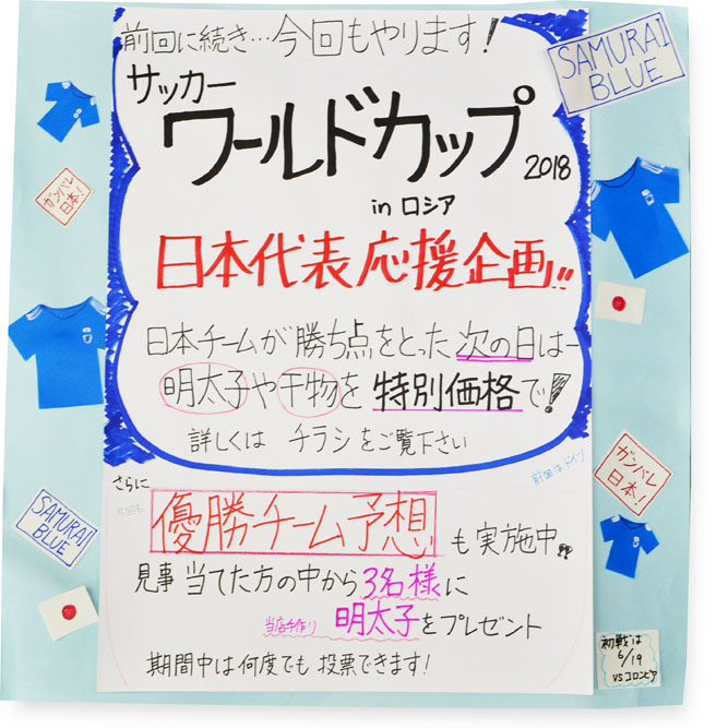 お客様にもサッカーを楽しんでいただこうと、応援企画をご用意しました。