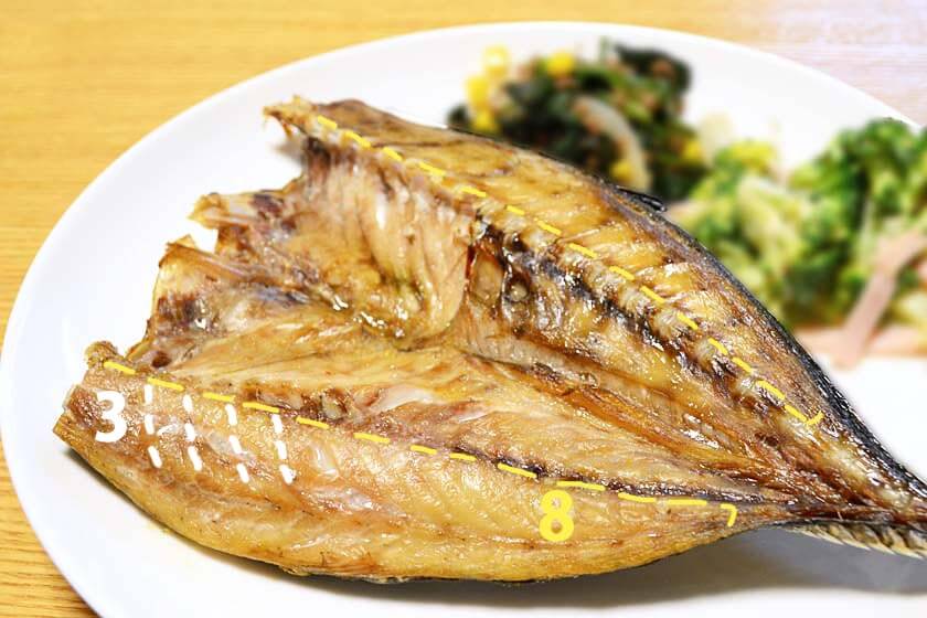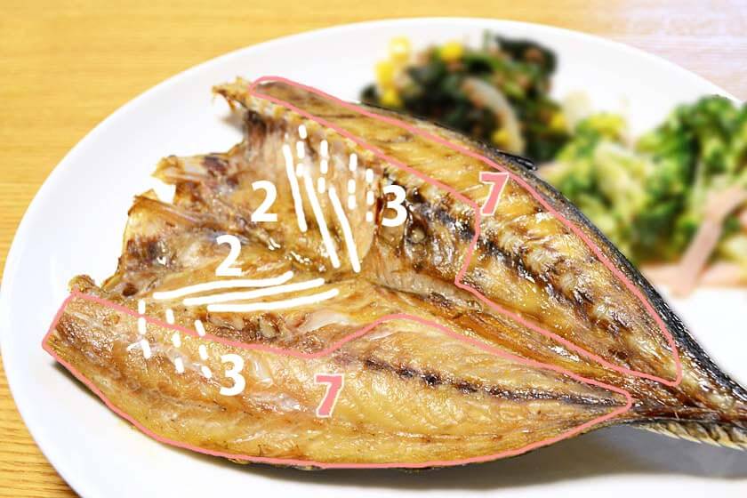 上の写真の8の部分を食べ終えたら、残っている白い範囲の7の部分まで骨がありませんので食べちゃいましょう!