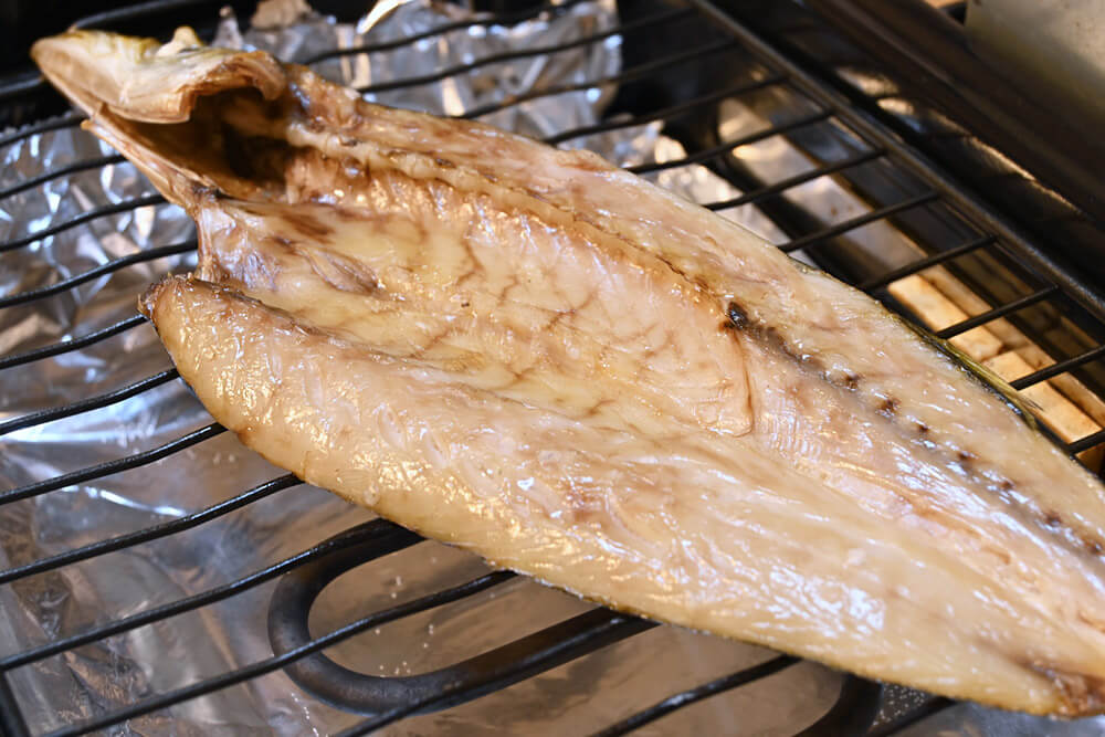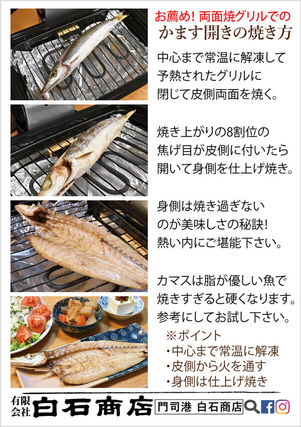 HOME BLOG 食べてみた ふっくら焼き上げる『かますの開き』の焼き方 ふっくら焼き上げる『かますの開き』の焼き方 2024.03.22食べてみた この記事のタイトルとURLをコピーする 『かます』という魚は水分が多い種類になるので、干物にすると旨味が凝縮してより美味しくなると言われています。 サバなどとは違い白身の優しい脂のりなので、焼き方が『かますの開き』を美味しく味わうカギになります! 今回は、『開きを閉じる』常識破りの荒業で焼いてみました笑 では、いってみましょう! いつもの手順で【卓上魚焼きグリル】を後片付けが簡単になるように準備して そして中心まで常温に解凍したかますの開きを【閉じて】網に載せ、焼いていきます。 身側から水分が失うことを最小限にする為です。 皮側に、焼き上がりの8割ほど焼き目をつけましょう。 残りの2割は・・・ 閉じて焼いたかますを開いて、身側も焼いていきます。 焼き過ぎは厳禁です! 全体にちょっと色がつくくらいで出来上がりです。 熱々を早めにお召し上がりください。 カマスらしい上品な美味しさを味わえると思います! 白石商店では、カマスの中でも大きめのサイズを販売しますので、優しくもしっかりと脂のりを楽しめると思いますよ。 『両面焼きグリルを使った、かますの美味しい焼き方』しおりをお入れしていますので、贈答にもご利用くださいませ。 今回も、美味しくいただきました!ごちそうさまでした。 ※かますの入ったセットに、『焼き方のしおり』入れてます。 Post この記事のタイトルとURLをコピーする 食べてみた 干物, 門司港, 白石商店, かますの開き 贈った方からも、初めて白石商店さんの干物を食べたけど、とっても美味しかったので、今度は自宅用に 2024年4月営業日のご案内です